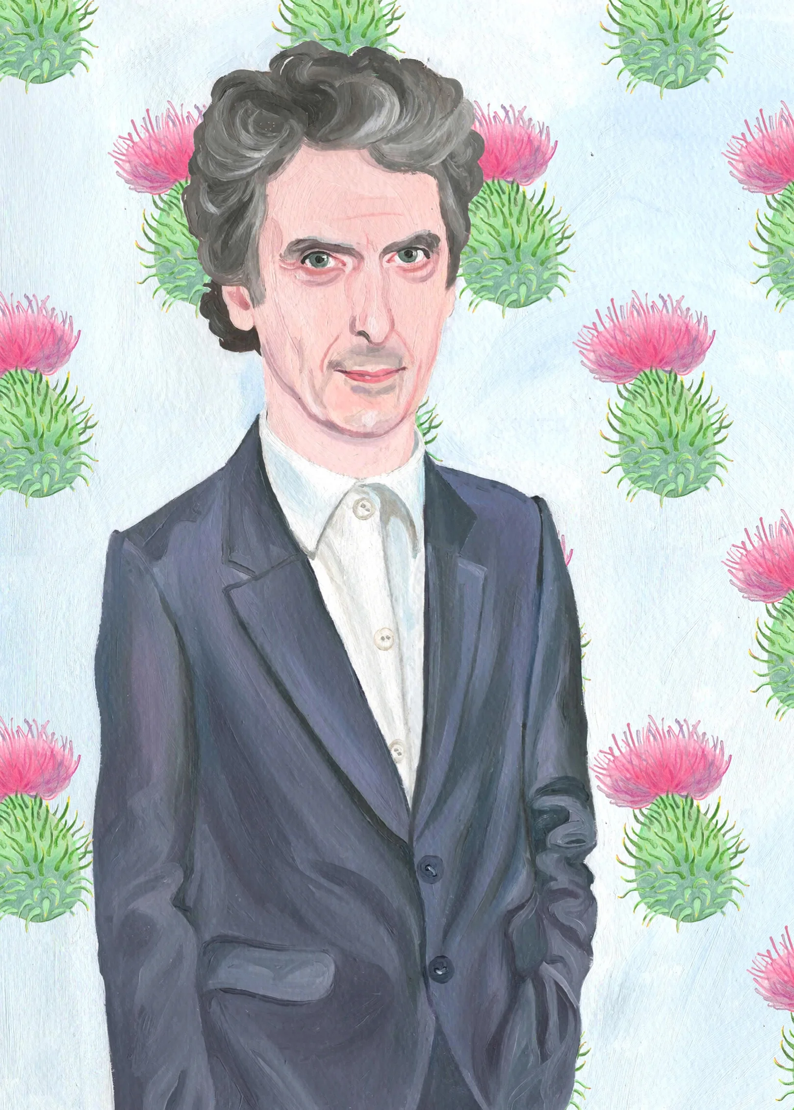 A portrait of the actor Peter Capaldi (AKA Doctor Who) with a thistle background showing his Scottish heritage.